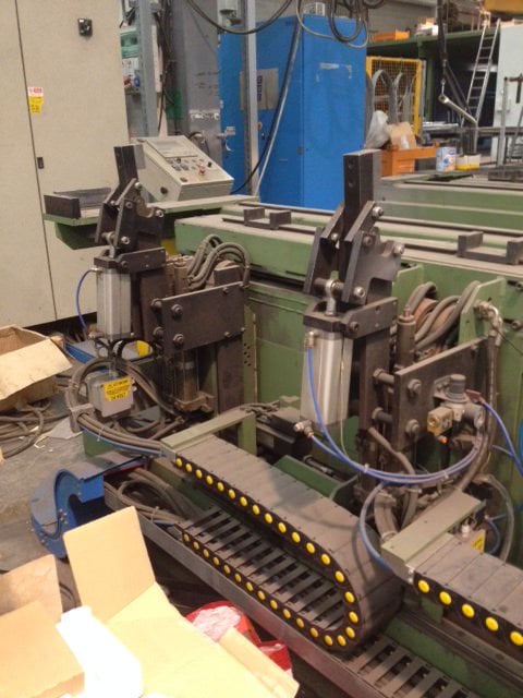 ISOLA D'ASSEMBLAGGIO PORTE BASCULANTI COMPOSTA DA UN BANCO DI FORMATURA COSTITUITO DA TRE ASSI CONTROLLATI E DOTATI DI CARRI TRASFERSALI CONTROLLATI DA C.N.C. SUI QUALI SONO APPLICATE LE PUNTATRICI