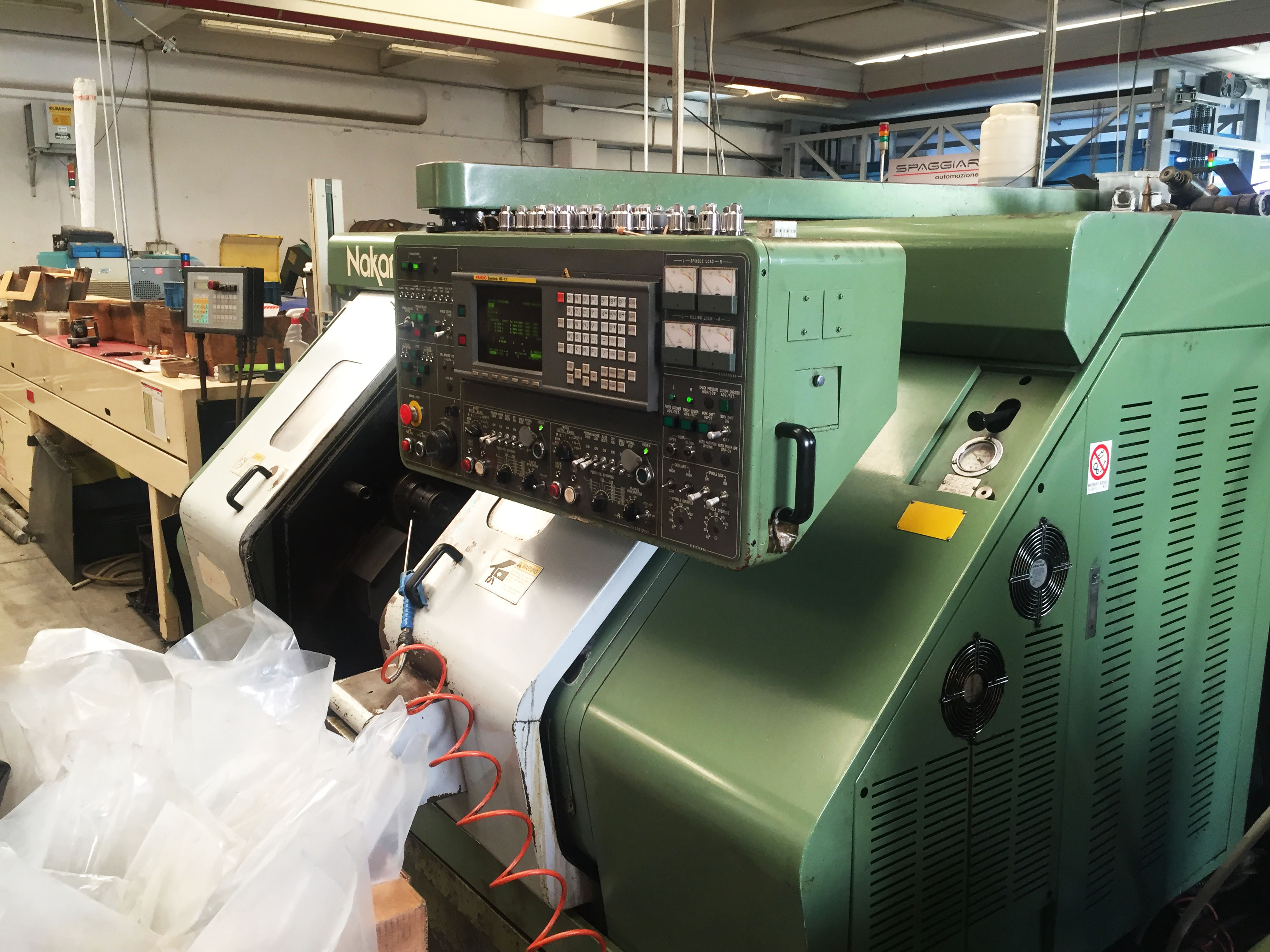 Tornio Nakamura Tome TW 10 + spingibarra Cucchi Anno 1997, passaggio barra 42 24 utensili SV x 2 torrette motorizzate Contromandrino Presetting utensili automatico Paletta raccogli pezzo